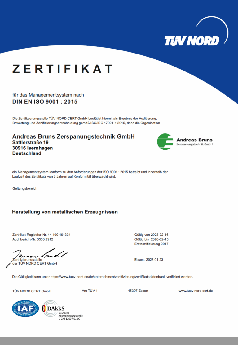 Seit 2017 sind wir nach DIN EN ISO 9001:2015 zertifiziert, und unser Qualitätsmanagement wird regelmäßig rezertifiziert, zuletzt ohne Beanstandungen.
